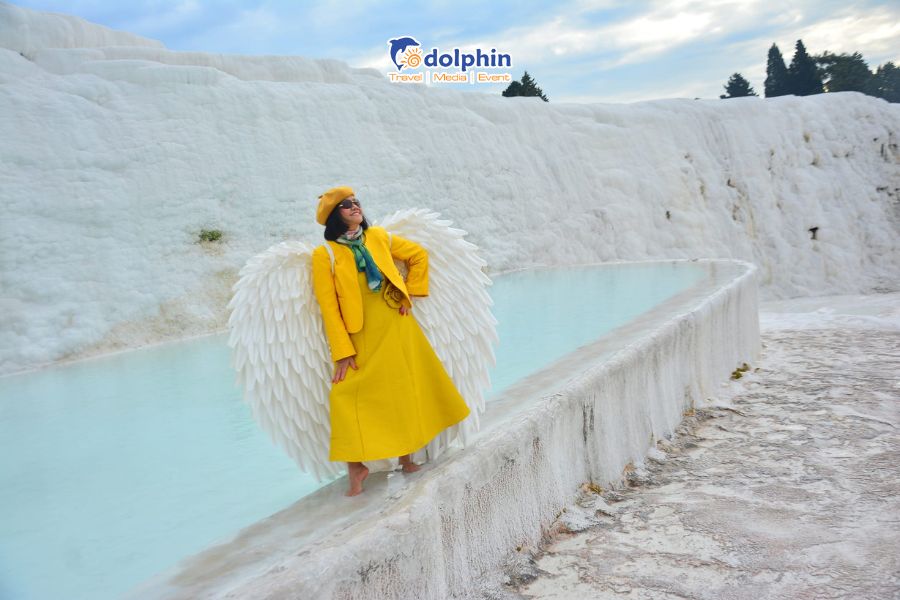 Đoàn tiếp tục khởi hành tới Pamukkale Đây là một điểm đến hấp dẫn nhất nhì Thổ Nhĩ Kỳ bởi vẻ đẹp khó tin chỉ xuất hiện trong những bộ phim khoa học viễn tưởng của nó. Nếu chỉ nhìn trên ảnh hay những thước phim từ trên cao, người ta dễ nhầm lẫn đây là một núi tuyết khổng lồ nhưng thật ra đó chính là một vùng núi đá vô canxi cacbonic được tích tụ hang nghìn năm với hình dáng như những hồ nước xếp thành từng tầng được tạo thành bởi quá trình biến đổi. Nước trong những “hồ bông” này là nước khoáng tự nhiên được hình thành từ mạch khoáng ngầm với màu xanh da trời và chứa nhiều khoáng chất có lợi cho sức khỏe và có thể hỗ trợ chữa bệnh. Ở Pamukkale có đến 17 suối nước nóng với nhiệt độ từ 35 – 100 độ nên từ lâu người ta đã biết tận dụng để mở các dịch vụ spa, nghỉ dưỡng để phục vụ du khách.